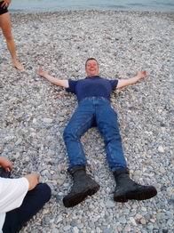 Wir fürchteten schon, ganz knülle zu werden, falls die Warterei so weiterginge. Irgendwann trafen Jo und Konsorten ein und gesellten sich nach dem frisch machen zu uns. Von Peter, Sandra und Ralf war aber weit und breit keine Spur. Ein Kontrollanruf brachte zu Tage, dass sie noch vor dem Col de Turini und wohl noch einige Zeit brauchen würden. Geschlagene eineinhalb Stunden später tauchten sie dann (von unzähligen Rauchpausen ermattet?) auf, wir sorgten uns schon ob wir Menton, den Endpunkt der Tour noch bei Tageslicht noch erreichen würden. Ohne auf die Neuankömmlinge zu warten düsten wir gleich los, die letzten 20 km und Kurven runter bis zum großen Finale der Tour: Menton an der Côte d'Azur. Durch den Stadtverkehr mussten wir uns noch durchkämpfen, dann erreichten wir den Strand.