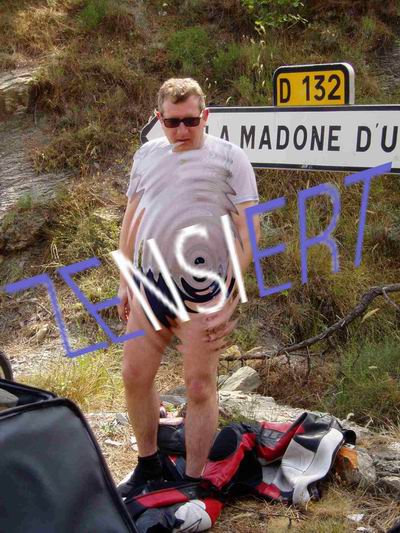 Etwas anderes wie fahren war nicht drin, der Fahrtwind brachte wenigstens etwas Abkühlung. So schürte ich noch mal die Schlucht hinauf, weil Johannes nicht auftauchte (Alder Mo is ka DE-Zug...). Auf der Weiterfahrt tauchte noch mal ein Thermometer auf: 39 Grad im Schatten, es war also keine Fata Morgana gewesen. Wir fanden den Weg hinauf nach La Tour, es sollte die einzige Schotterstraße heute winken. Auf der Weiterfahrt verpassten wir eine Abzweigung und somit den Schotter, Gruppe B machte es später genau umgekehrt. Die Strecke war eine typische XBR-Kurvenstrecke, nur die Schweinehitze störte ein wenig. Jo blieb immer wieder zurück, was die anderen nicht freute, denn die Warterei bei den Temperaturen wurde zur Quälerei. Auf einem kleinen Pässchen zog Jo die Reißleine: er stellte die XR ab, riss den Helm runter und entledigte sich unter stöhnen und ächzen seines Lederkombis. Der Rest der Gruppe schaute etwas perplex dem Treiben zu, aber als dann Sir John von den Unterhosen in seiner ganzen Pracht vor uns stand, war das Gelächter nicht mehr zu unterdrücken.