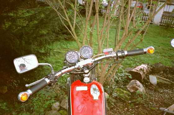 Wie das bei den SR'lern so üblich ist, wurde da ordentlich rumgeschraubt. Aber erst mal Platz genommen auf der stilbildenden Sitzbank. Ah ja; den Start Button sucht man vergeblich - also mal den Kickstarter ausgeklappt. Was so ein Kickstarter wert ist, weiß man als Besitzer einer kompressionserhöhten MuZ mit leerer Batterie: Anschieben ist nicht und nur ein freundlicher Dosentreiber mit Starthilfekabel kann helfen (peinlich). Im Gedanken daran Totpunkt der SR gesucht (kennt man ja als XBRler...) ein ordentlicher Tritt... nix, na gut nochmal, na also: Eine "Laut-ist-in-Tüte" bringt das Lebensgeräusch so richtig in die Birne... Hallo! Ist alles sehr schlank hier, der angebaute breite Lenker verstärkt den Eindruck noch.