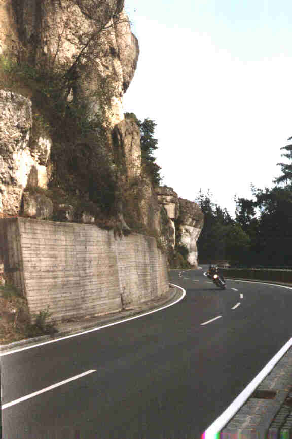 In den engen 180 Grad Kurven der Auffahrt bei Großweingarten will die Skorpion ab einem gewissen Winkel in die Kurve gedrückt werden. Hier fällt meine XBR mit ihrem 110er Reifchen hinten fast von selbst rein, ist jedoch längst nicht so stabil und zielgenau wie diese Skorpion. Ansonsten zeigt sich das Fahrwerk unbeeindruckt von jeglicher Störung auf dem Asphalt. Beim Wenden auf einer Nebenstraße fordern die Lenkerstummel und der somit begrenzte Lenkeinschlag ihren Tribut. Der Wendekreis liegt fast auf Kleinwagenniveau, fahrschulmäßiges Wenden in 3 Zügen sollte ab und zu geübt werden. ;-)
