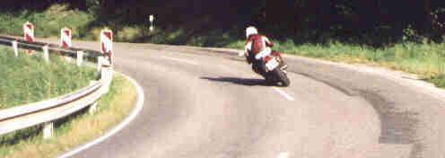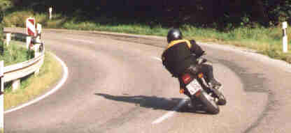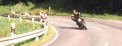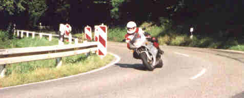 Gang rein, Füße hoch und HOPPLA, wo sind denn hier die Fußrasten. Gehirn an Füße: ungefähr dort wo bei der XBR die Beifahrerfußrasten sind! Also Knie leicht falten und weiter. Getriebe flutscht gut, Honda-Standard liegt aber etwas höher. Durchzug kommt gut von unten, mangels Drehzahlmesser jedoch schwer einzuschätzen ab wann. Richtig rund geht der Kolben so zwischen 3000 und 6000 U/min (geschätzt!!), danach wird´s zäh bis zum Erreichen des Drehzahlbegrenzers bei 7500 U/min (lt. Johannes, dem Besitzer). Die Vibrationen sind am rechten Griff stufenlos einzustellen, aber in keinem Drehzahlbereich abzustellen oder zu mindern. Erst jetzt merke ich wie ruhig und geschmeidig mein XBR-Motor eigentlich läuft. Die Mehrleistung von ca. 55 MuZ-PS gegenüber der 44 Honda-PS spielt eigentlich nur auf der Autobahn ab 150 km/h eine Rolle. Hier zeigt die Verkleidung eine wesentliche Winddruckentlastung und bei feuchten Sauwetter beiben die Beine sicherlich länger trocken als bei der nackten Honda.