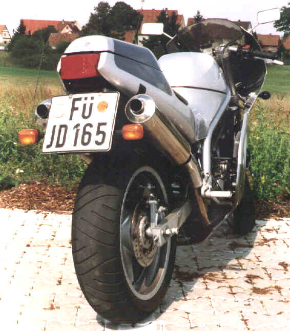 Für eine verkleidete Maschine eine saubere designte Linie bei der die Proportionen stimmen. Großer Endtopf, Brückenrohrrahmen, Upside-down-Gabel und Sitzbankhöcker fallen ins Auge. Die Miniaturspiegel und Blinker wurden vom Besitzer nachgerüstet und würden manch anderer Maschine auch gut stehen. Sozius möchte bei dem Höcker (Abdeckung abnehmbar) wohl niemand gern sein. Der 160er Hinterreifen macht Eindruck, die lächerliche Kettenführung und der kaum vorhandene Kettenschutz weniger. Der montierte Scottoiler verhilft der Kette zu etwas längerer Lebensdauer und der Felge zu einer gleichmäßigen Dauerölschicht.