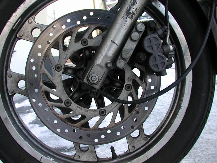 Die Bremsscheibe hat 320 mm Durchmesser, die Zange ist Original, der Adapter in Eigenbau gefräst. In Verbindung mit den Stahlflex-Leitungen bremst das ganz ordentlich.