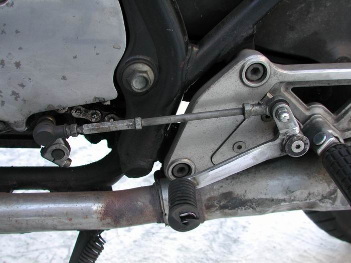 Die Aufnahme für die hintere Schalthebel-Achse besteht aus 2 Hälften, Alu-Dreiecke mit abgeschrägten Kanten, die genau in die Aussparung der Fußrastenplatte paßen. Gestänge ist von einer Suzi. Läßt sich ohne Spuren zurückbauen.