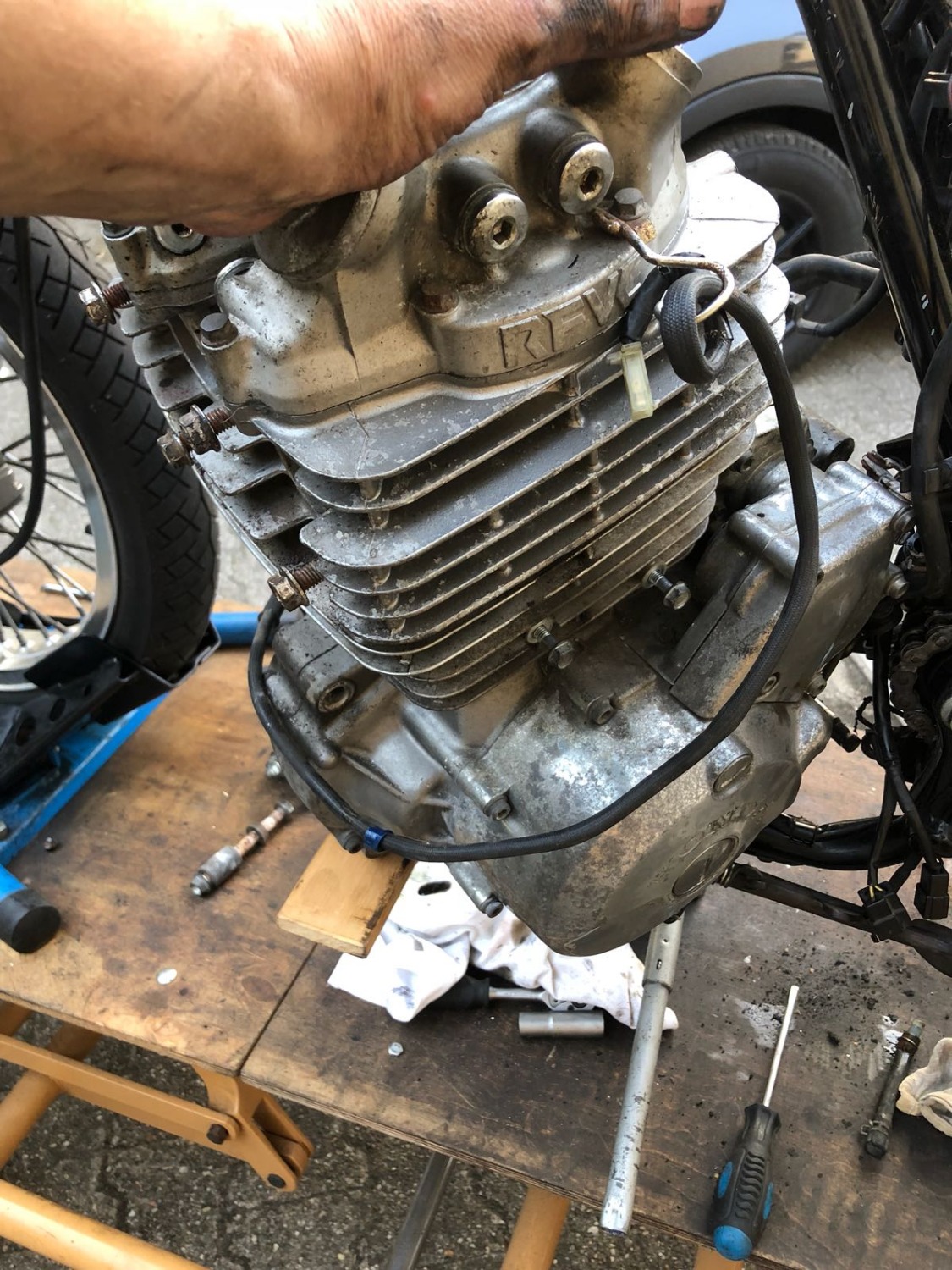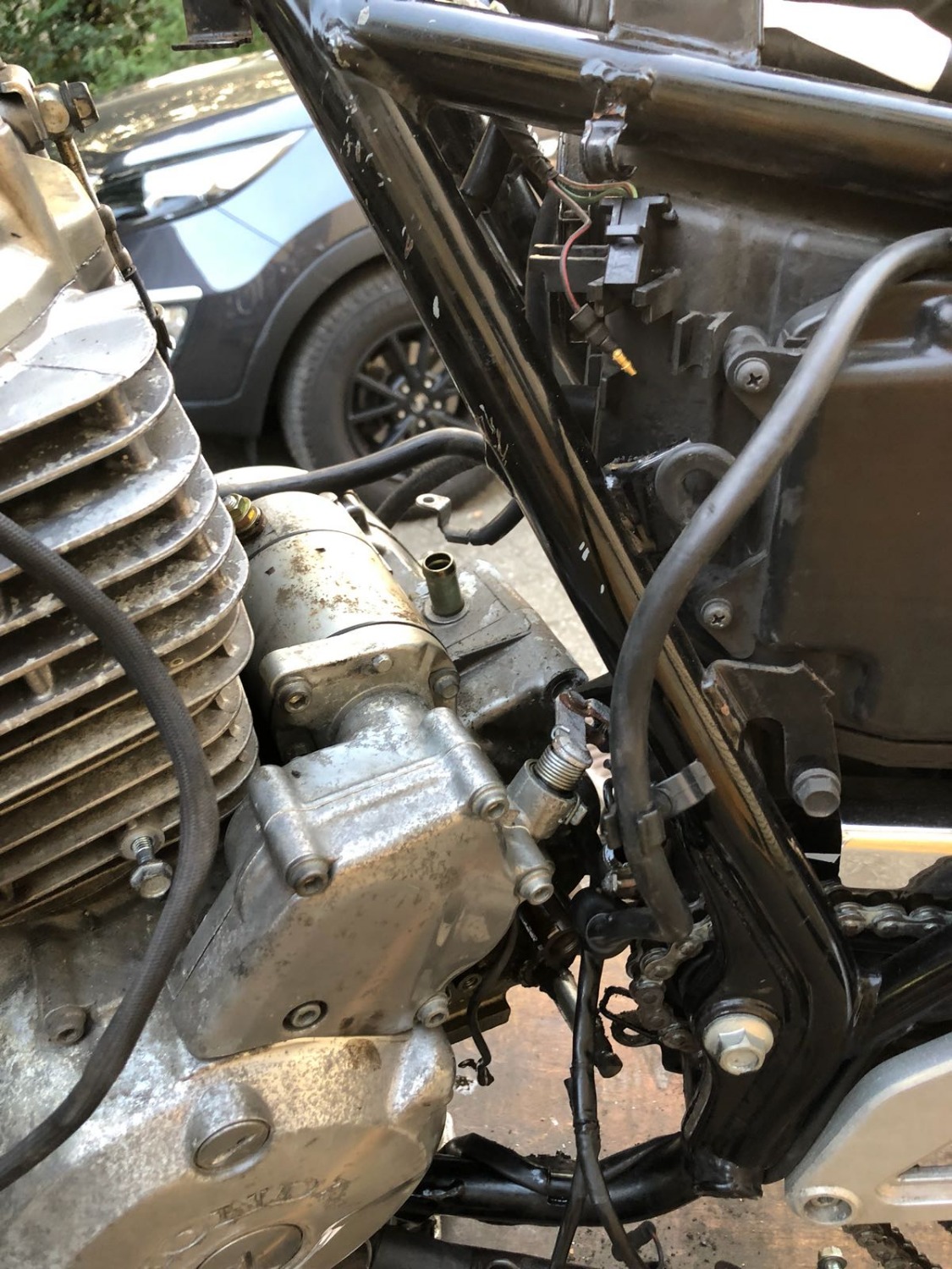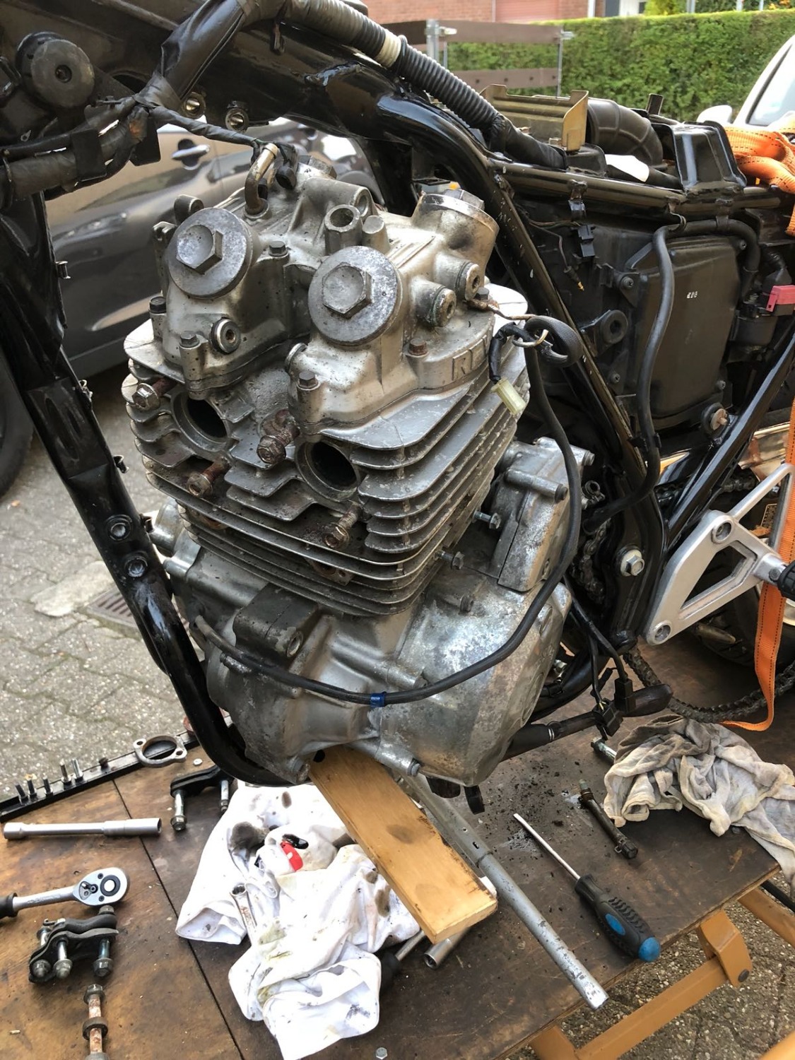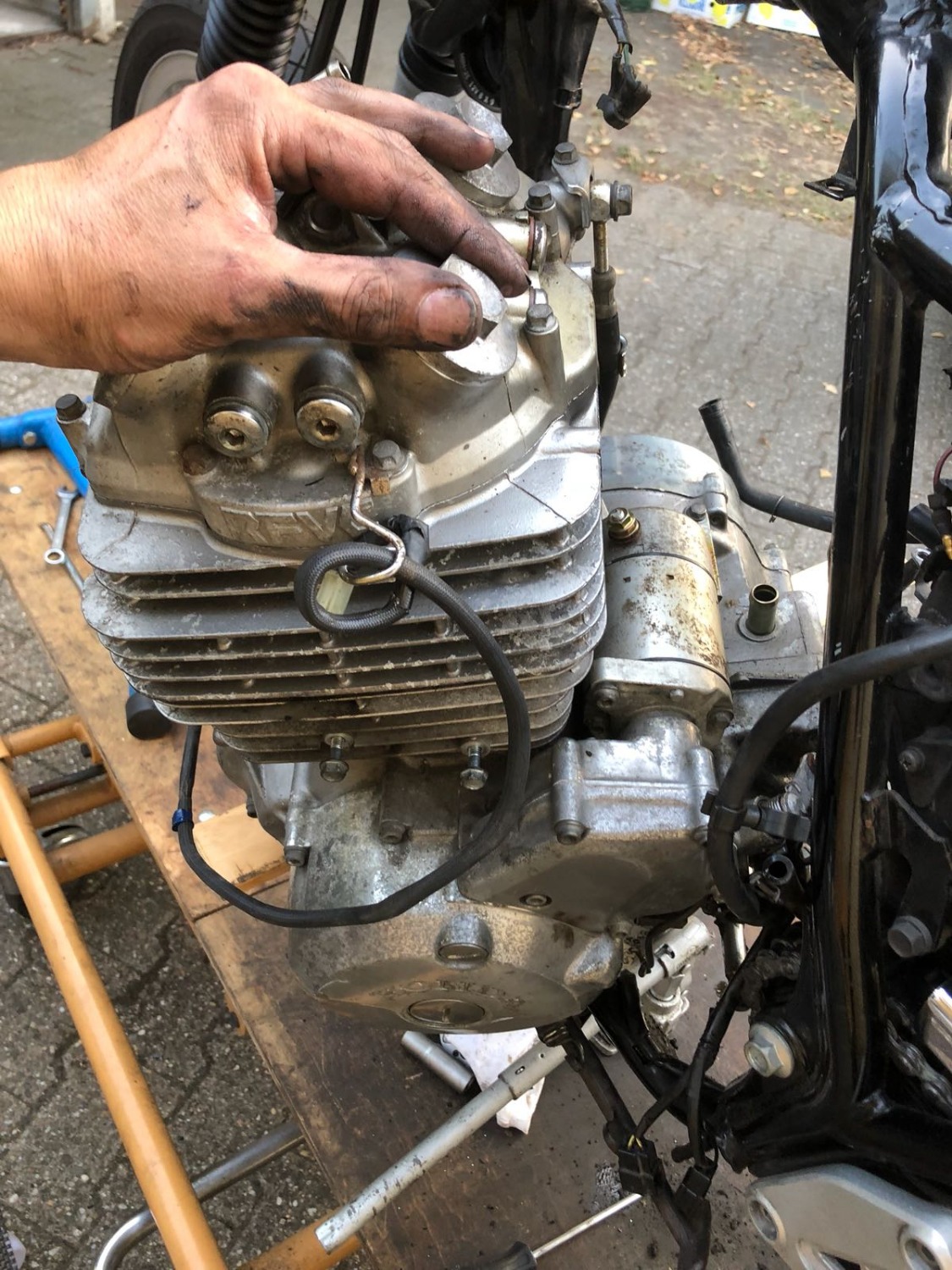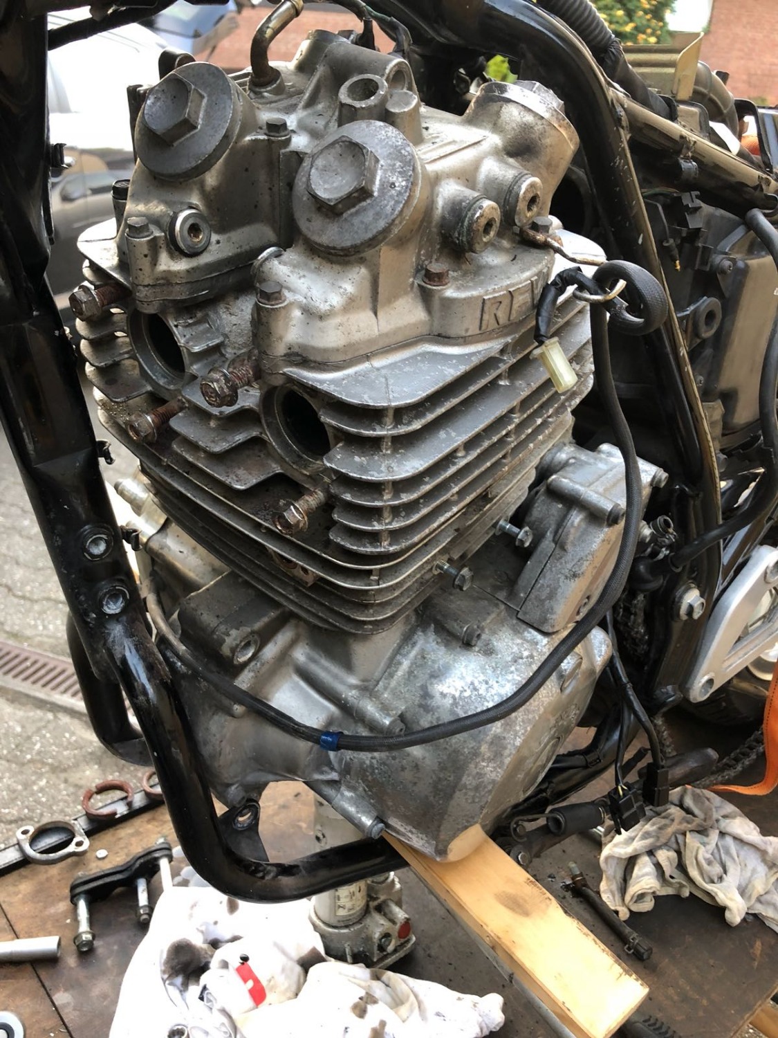 Ich bin irgendwie noch skeptisch. Das Reindrehen hat bei mir nicht so richtig geklappt, weil der Motor sich so entweder unten in der Rahmengabel oder mit den Krümmerstehbolzen oben am Rahmenrohr geklemmt hat. Aber vielleicht hatte ich ihn hinten in der falschen Höhe.