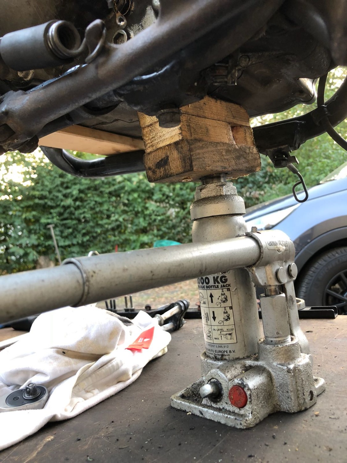 Als Hilfsmittel benötigt man lediglich eine Holzlatte (oder ähnliches) und einen kleinen Wagenheber.