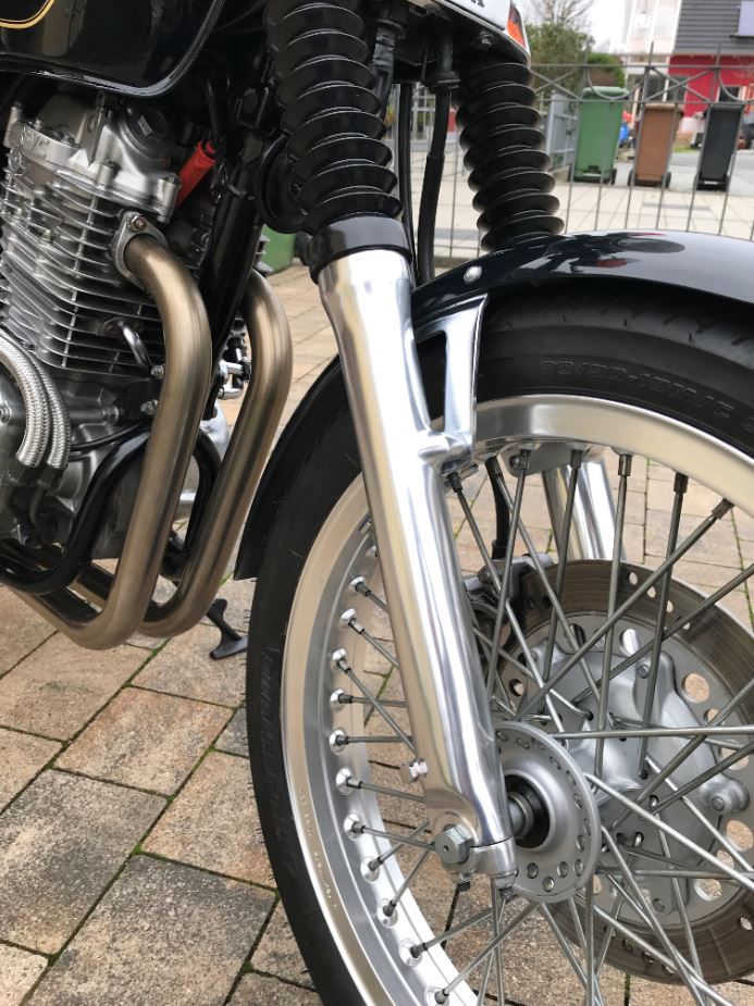Ich müsste die Lenkerstummel und den Scheinwerfer nicht demontieren. Auch brauche ich keinen (nicht vorhandenen) Schraubstock zum auseinandernehmen der Gabelteile.