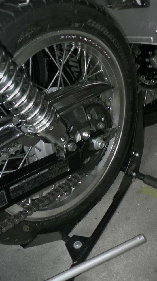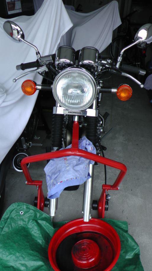 Die beiden Hämmer steckt man, wenn das Standrohr raus ist, durch den sonst frei schwebenden Stummel mit dem Stiel durch beide Gabelbrücken und die Lampenhalter. Wenn Du die Hämmer oder irgendetwas anderes beim Ausbauderder Standrohre peau a peau reinsteckst, dann hast du hinterher alle Kabel und Züge wieder an der gleichen Stelleund mußt nicht überlegen, ob vor oder hinter dem Standrohr. Die Position der Originalstummel läßt sich übrigens durch eine nach unten raus schauende Fixierschraube hinterher wieder sicher im Spalt der oberen Gabelbrücke an der gleichen Stelle wieder positionieren. Auf den Standrohren sind Markierungen an welcher Stelle die Lampenhalter sitzen sollen und im Scheinwerferhalter ist vorne oben ein Schlitz der mit einer Markierung an der Lampe fluchtet.