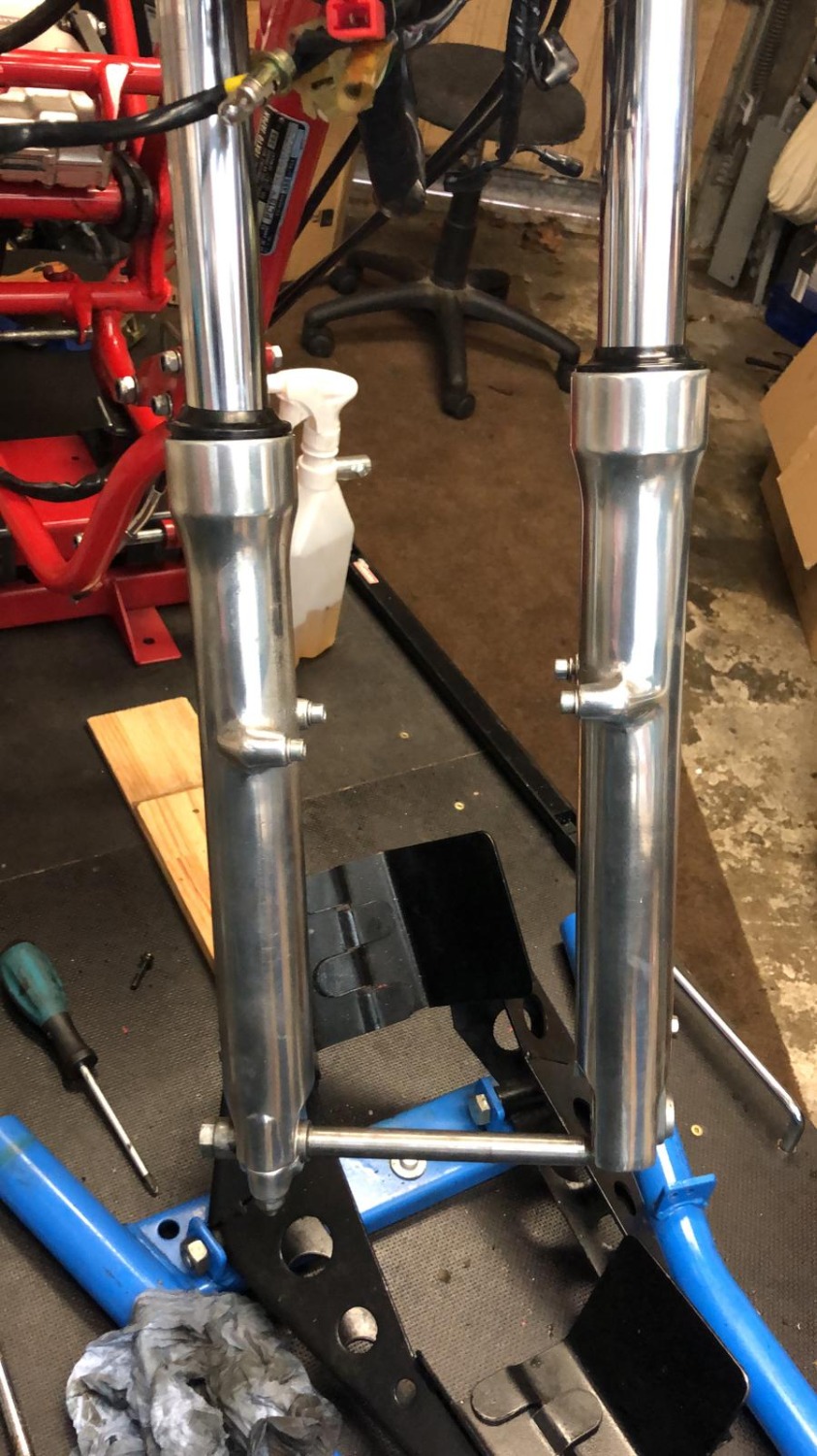 Der Gabelumbau ist keine große Sache. Die PC17 (CB450S) Standrohre passen ohne Änderung in die XBR Tauchrohre. Die Buchsen oben in den Tauchrohren sind bei beiden Gabeln identisch. Meine Gabel besteht aus PC15 Tauchrohren mit PC17 Standrohren und Innereien.