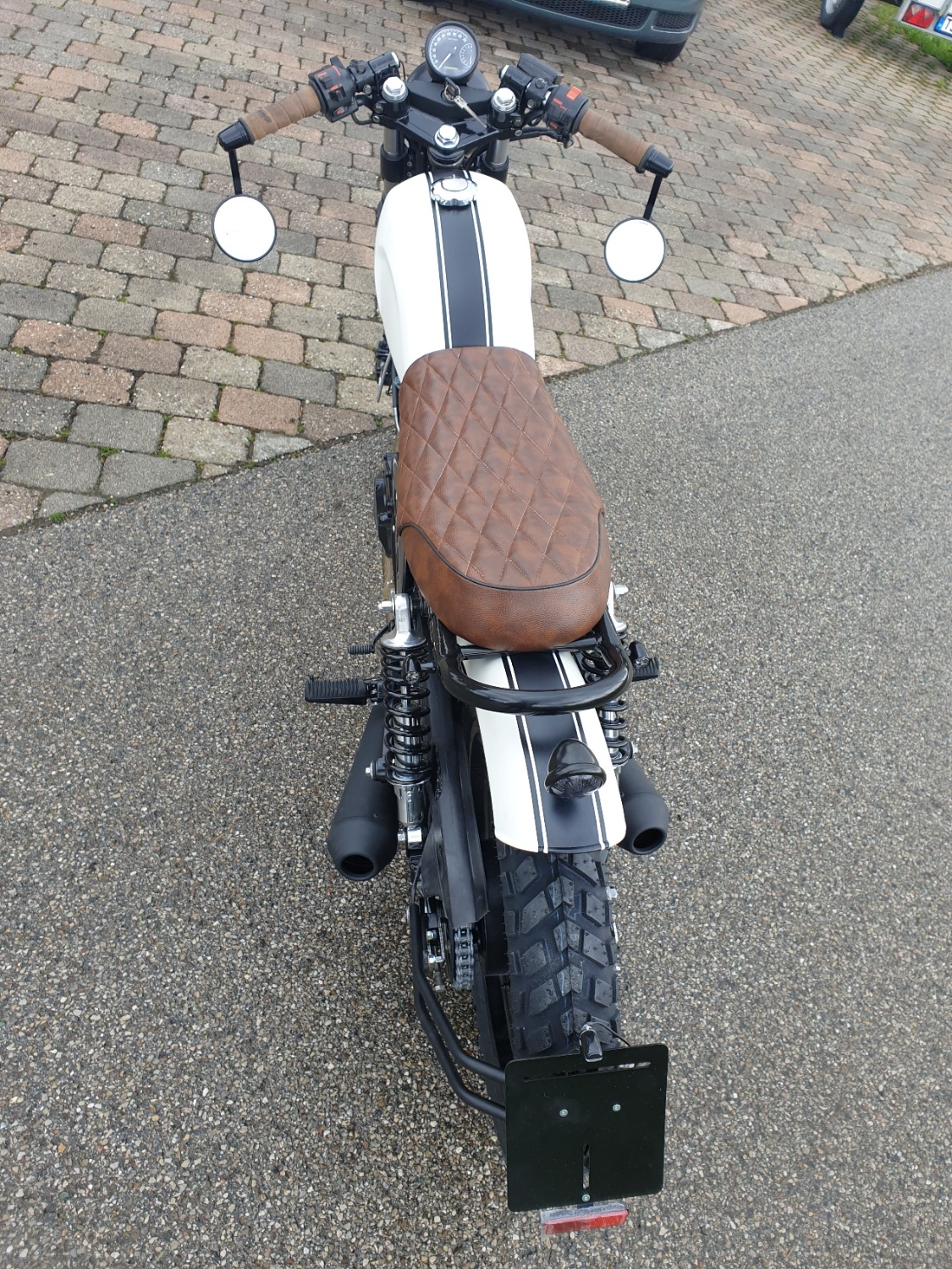 Du hast zumindest noch nicht den selbst einklappenden Seitenständer dran, den Du eigentlich für den nächste Tüv brauchst, dann fehlt höchstwahrscheinlich das Beilegeblech unter der hinteren Tankbefestigung (erkennbar an dem Spalt ungleichen Spalt zwischen Tank/Seitenblech) und auch die Öltankbefestigung links ist dann wohl auch nicht auf den zu empfehlenden Stand gebracht.