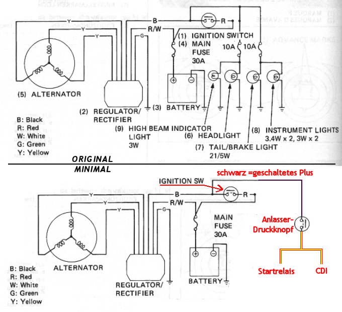 Kickstarter ab? dann muss mehr dazu: Batterie, Regler wenn die B auch geladen werden soll, Starter-Hauptrelais, Anlasser-Druckknopf und 'n Hauptschalter so dass nicht jeder mal der Starterbutton probieren kann.