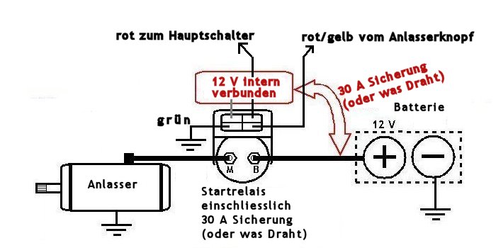 Hat jemand sowas schon mal gemacht oder gar einen Schaltplan. Ich habe nur einen Ein Schalter und einen Drücker für den Anlasser, das wars.