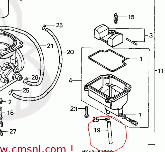 Pos. 19 heißt überstezt Überlaufrohr, aber das (Rohr) sitzt innen im Schwimmerkammer; wenn Nivo zu hoch, geht's daraus (anstelle in den Zylinder).
