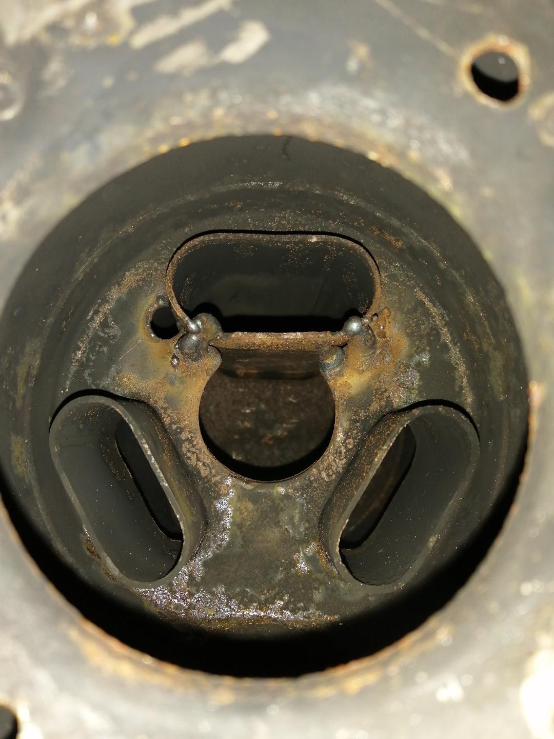 Krümmer mit Endtopf abgebaut und die 4 Nieten aufgebohrt um reinzusehen.