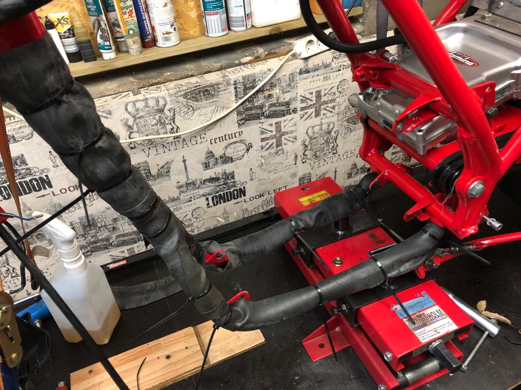 (Wenn man vorher den Kopf runter hatte, baut man ihn erst drauf, wenn der Motor schon drin ist.).