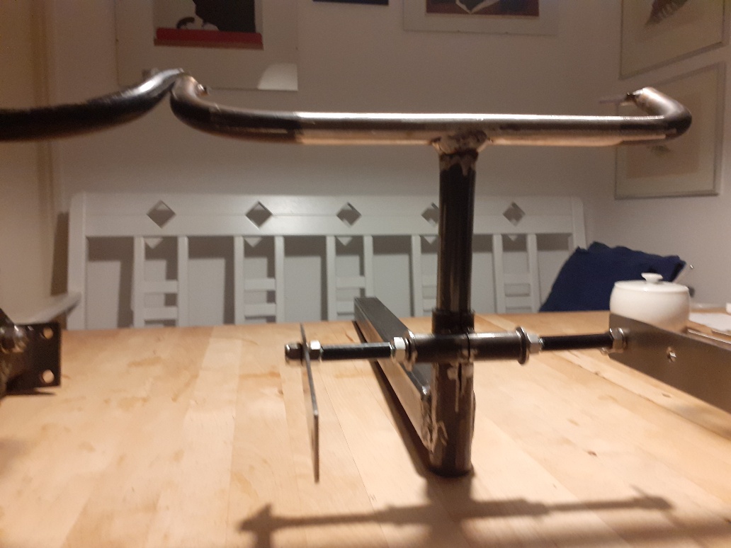 Achso, für Andreas ist es jetzt zu spät, aber vielleicht freut sich zu einem späteren Zeitpunkt mal jemand, wenn er einen universell verwendbaren Neubau sehen kann. Er ist stark von einer ganz frühen höhenverstellbaren Balcerek Halterung "abgekupfert". Die waagerechte Durchgangsschraube, die aussen die beiden Halter für den Scheinwerfer trägt, spannt innen die geschlitzte Aussenhülse. Wenn man die DS innen löst, kann man dann das zentrale den oberen Bügel tragende Rohr nach oben korrigieren oder auch, wenn der Anschluß am Steuerrohr etwas seitlich verspannt ist, ein bisschen ausgleichend drehen.