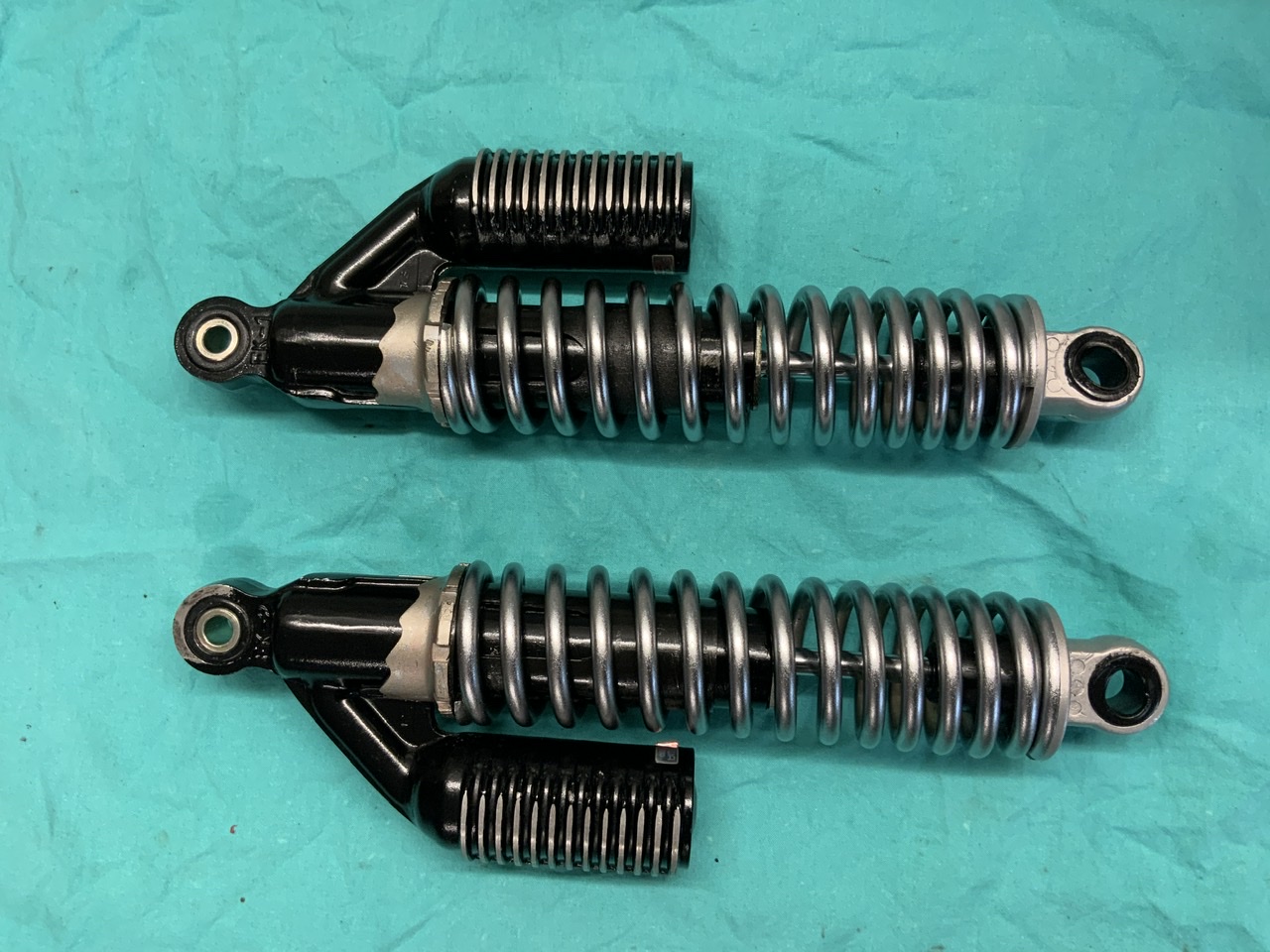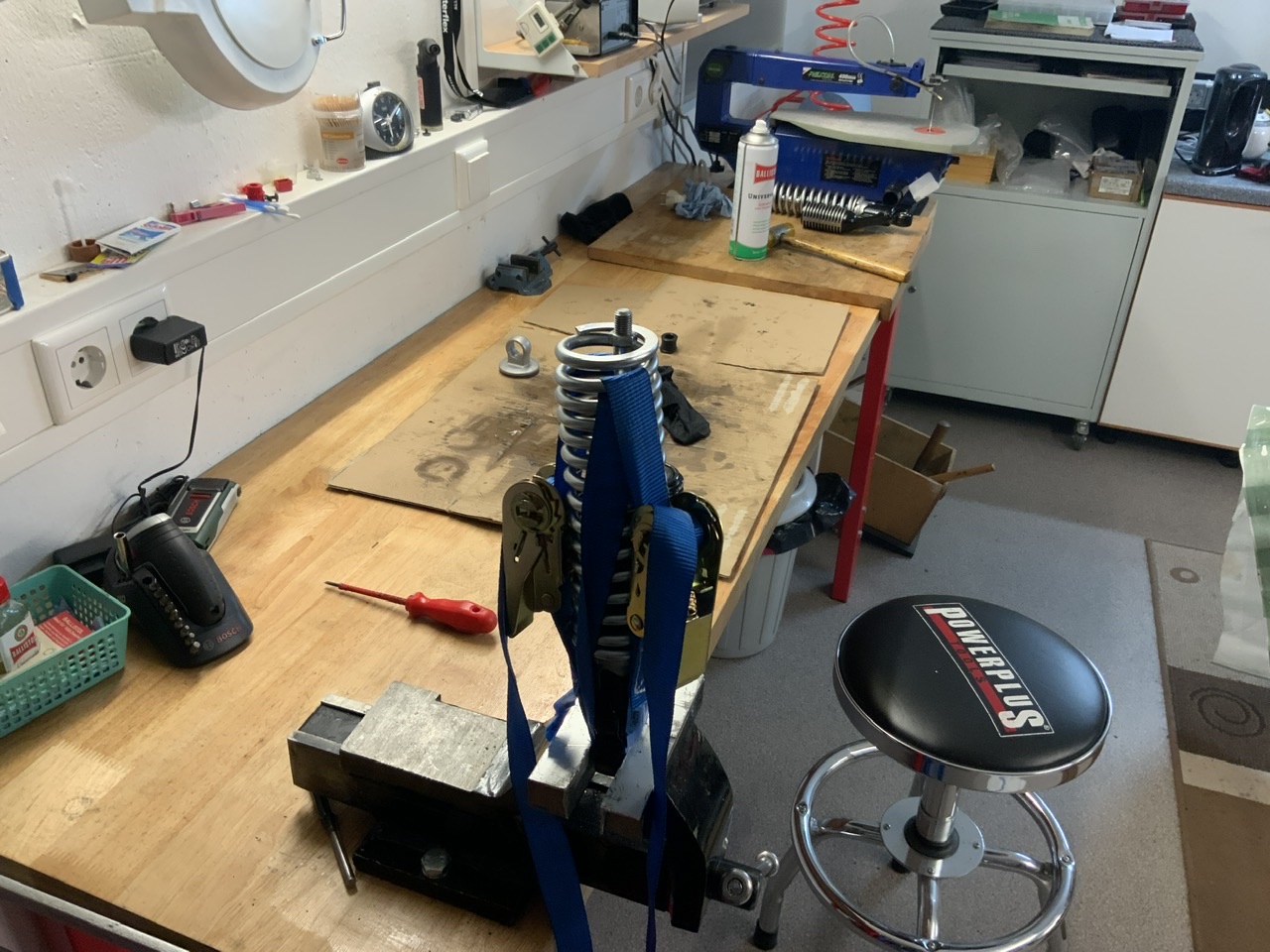 Andreas wird es sicher gesehen haben. Für die, die Federn zum optischen Aufarbeiten abschrauben wollen. Man muß erst die Feder sichern, geht zwar auch mit den hier verwendeten Spanngurten. Ist trotz der noch gar mal so großen Kräften nicht "State of the Art" und besser/sicherer sind eigentlich geeignete Spanner. Man kann das Dämpfungsgummi etwas runterziehen, darunter ist dann in der Dämpferstange ein Schlüsselansatz, also bloß nix mit der Zange und wenn der Teller sich nicht gut abschrauben läßt, evtl etwas Wärme, weil da, ich glaube, serienmäßig Schraubensicherung vervendet wurde. Leider ist nach dem Lackieren, dort wo die Feder scheuert leider sehr schnell wieder der Lack ab und deshalb habe ich es nicht wiederholt.