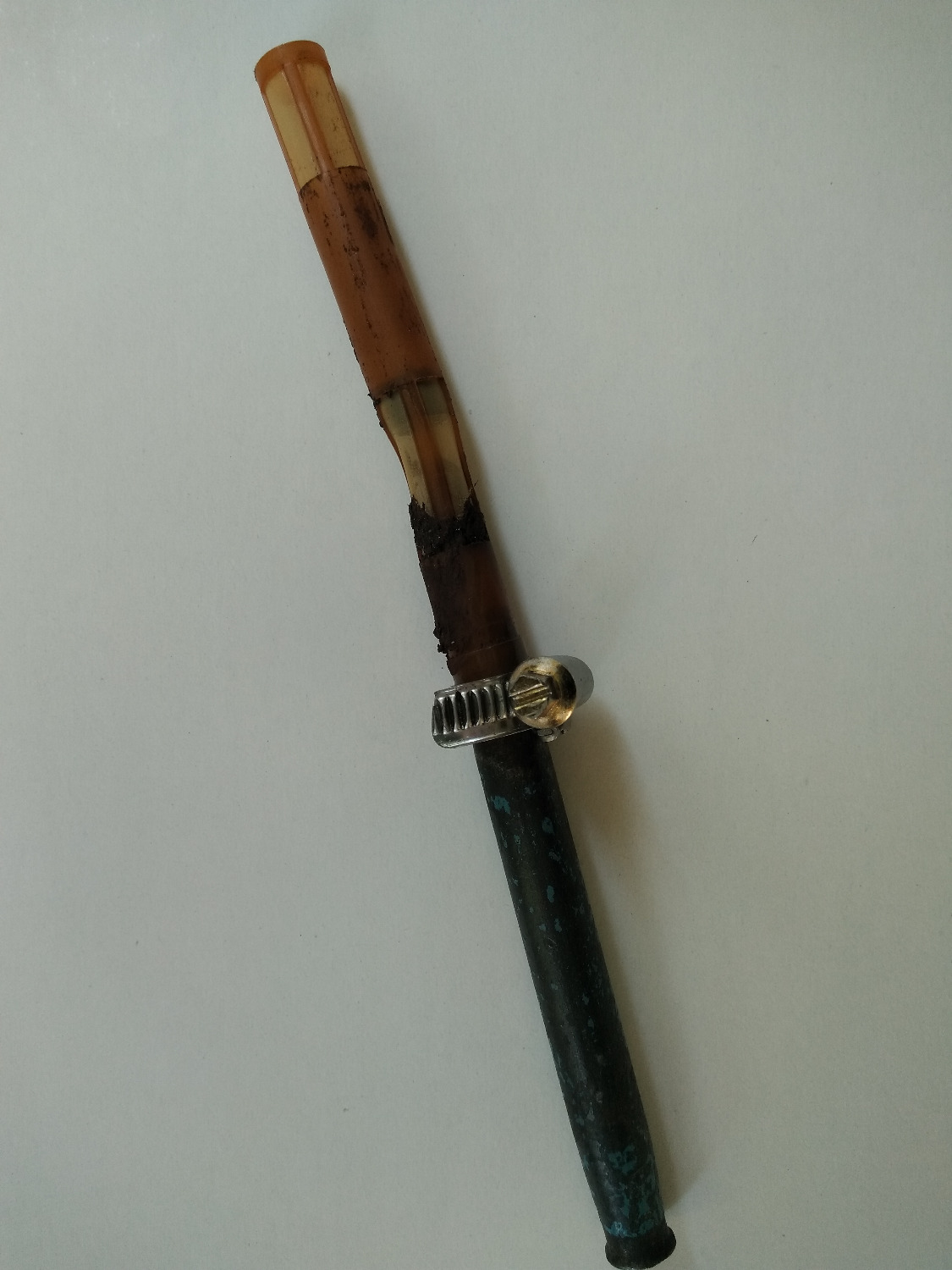 Ich kann kein Patentrezept anbieten, wie man das Filterrohr wirklich zuverläßig schadensfrei rausbekommt, mittlerweile kratze ich gerne den oberflächlichen Rost weg und versuche da entweder irgendetwas rostlösendes einzubringen. Alternativ kann man das Ding versuchen zu lösen, dadurch daß man da vorsichtig Druckluft in den Spalt zwischen Rohr und Tank bringt. Mit der Zange verwürgt man/ich leider fast immer (siehe unten).