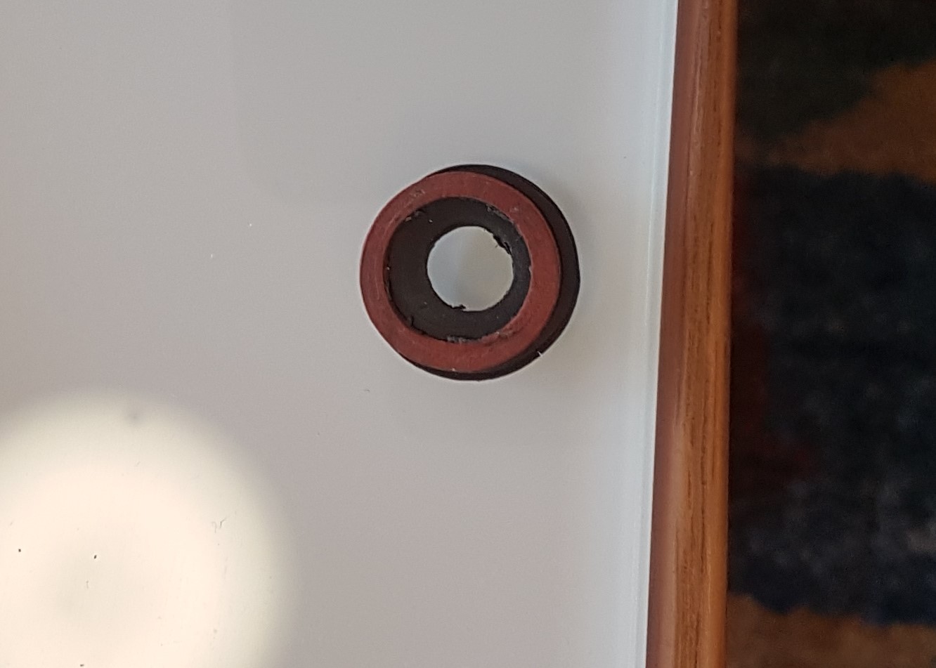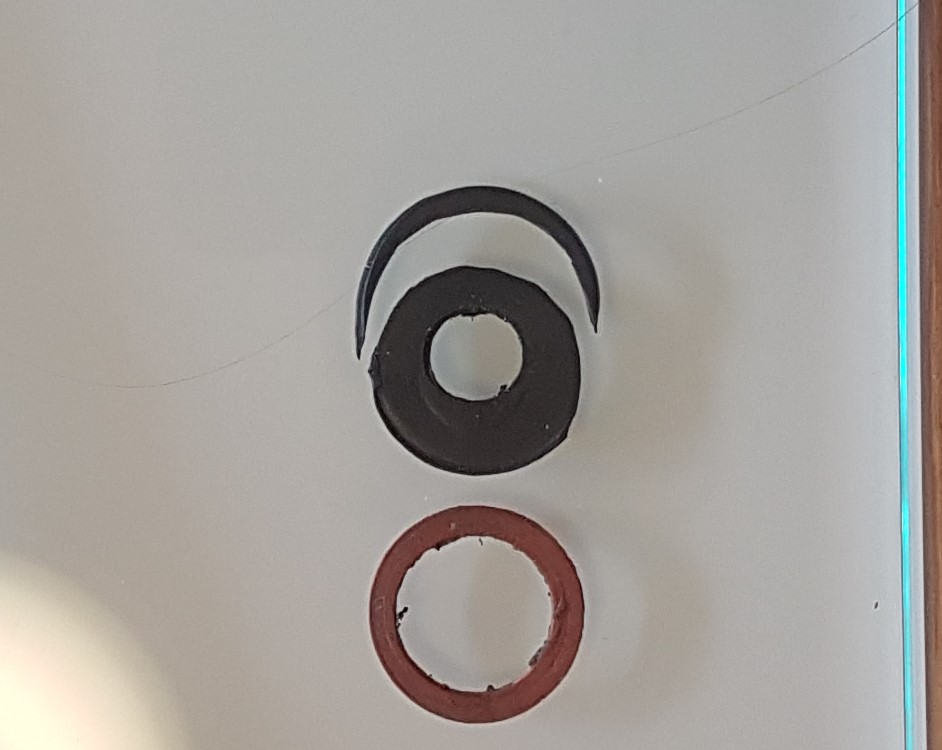 Das original Steigrohr sitzt leider nicht mittig im HAhngehäuse. Kann sein, dass man die VErschraubung zum TAnk mit der neuen schwarzen 16 mm Gummidichtung zusätzlich zur original Dichtung auch dicht bekommen hätte. Ich habe mir lieber eine neue Dichtung mit außermittigem 8 mm Loch und 21 mm außen geschnitten.