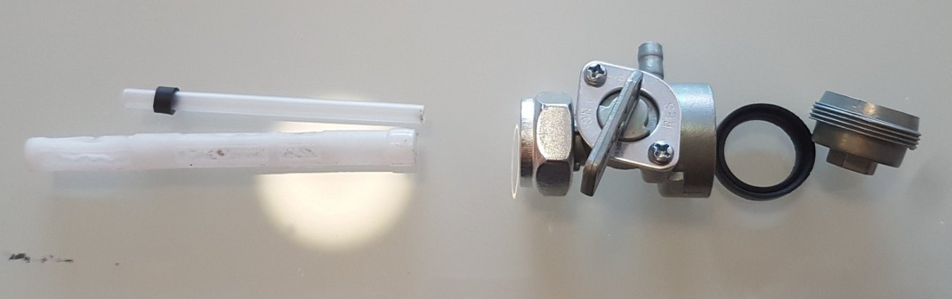 Der "16mm Benzinhahn Kraftstoffhahn für Honda CB750A CB400F CB550F CB750F" für knapp 5 EUR wurde pünktlich nach 2 Wochen geliefert. Das Plastiksteigrohr ist nur eingesteckt und lässt sich leicht entnehmen. Aus diesen Teilen kann man die Funktion des originalen Siebes nachbauen.
