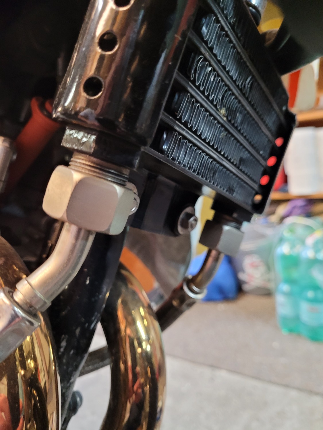 Mechanisch sehr scöne Lösung, Ralf, bringt aber eben mehr Hitze an die Motortop/Ventilbereich. nicht wahr? Wurde meinen, ein seitensmontierte Ölkuehler dagegen nicht.