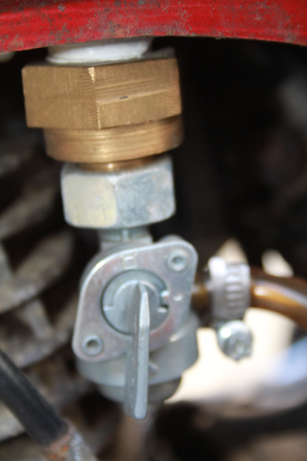 Benzinhahn aus dem Zubehör für ca.10€-Aus einer Messingwelle einen Adapter gedreht mit Gewinde M20 x 1 (Tank) und Gewinde M16 x 1,5 (neuer Bezinhahn) Das Reserveröhrchen muss in der Länge angepasst werden! Sonst droht böse Überraschung. (Kein Sprit mehr)