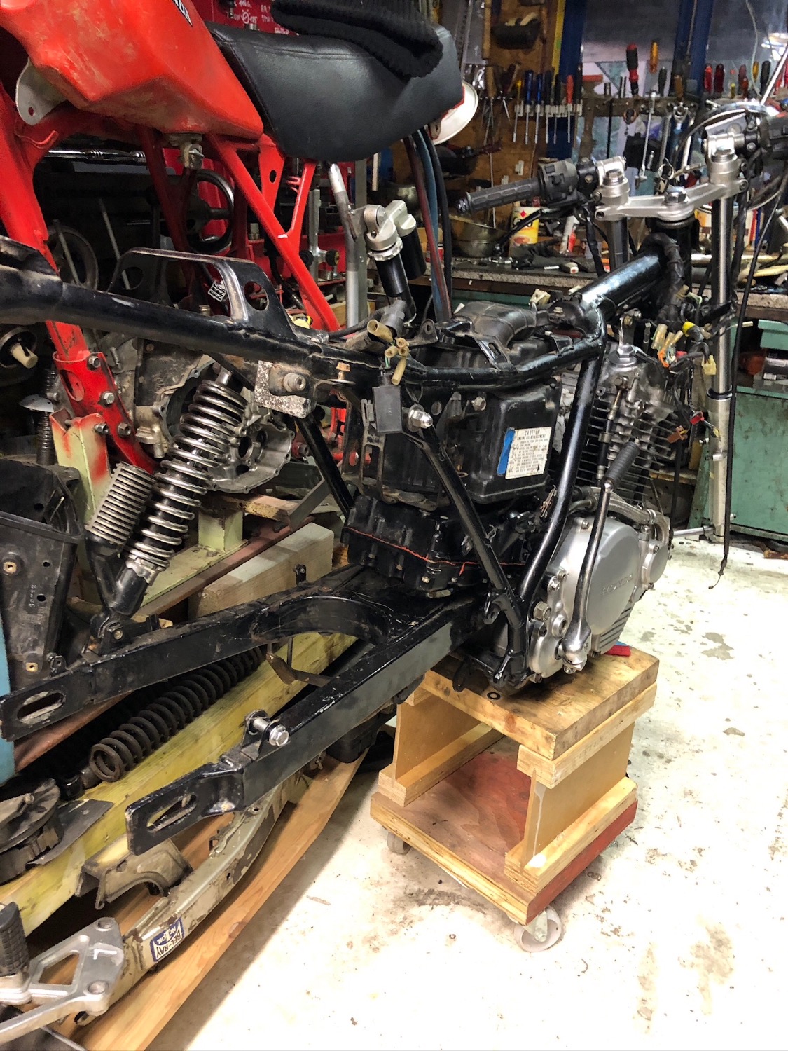 Letztes Jahr schenkte mir ein Kumpel eine 83er XR500 und nun liegen bei mir 3 XBR Motore, 2 Rahmen und ich hoffe Teile um daraus eine XBR zu zaubern.