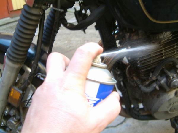 Vorne Beinchen hoch... da lassen sich Felden und Speichen besser reinigen, Das Öl wird dann mit Dampfstrahler entfernt und mit Waschpulver und Schampoo und Wurzelbürste nach gebürstet.Dann noch mal Dampfstrahlen und mit Druckluft abblasen.....