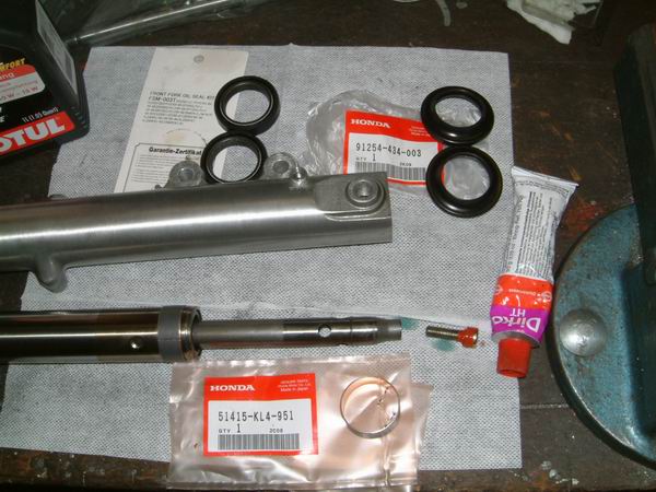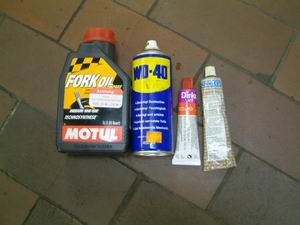 Praktisch sind Gabelölflaschen mit Schlauch, damit man zur Not zuvieleingefülltes Gabelöl auch wieder absaugen kann.Ich habe schon seit langem die Orginalfedern mit Hülse gegen eine progressiveGabelfeder ohne Hülse aus dem Zubehör getauscht. WD40 (zum Reinigen), Dirkol (zum Abdichten) und Kupferpaste/MOS2 (für dieSchrauben) habe ich zur Hand. Wer schlau ist besorgt sich vorher noch dieGleitbuchsen, die Schmutzabstreifringe, die eigentlichen Gabeldichtringe unddie Kupferdichtungen...