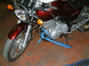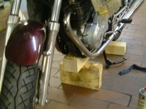 Und als Beispiel wie ich die XBR mit Hauptständer zum Gabelausbau aufbocke