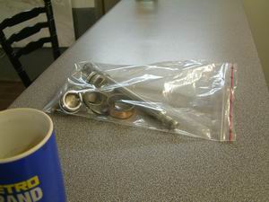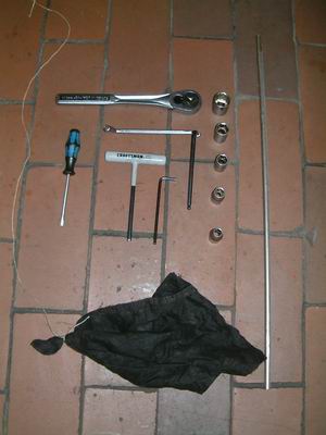 Das Werkzeug: Ratsche, 17er, 15er, 14er, 12er, 10er, 6er Inbus mitVerlängerung, 5er Inbus, 4,5er Flachschlitzschraubenzieher, Stange, Lappen mitSchnur, Nicht abgebildet: Hammer (300g), Kupfertreiber, 22er (oder war es eine24er??) Nuß und Ratsche für die Gabelstopfen, Lineal, Tesafilm, Bierfilzl, Bieroder Kaffee (je nachdem)