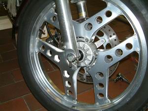 Vor dem Zusammenbau schraube ich alle Schrauben ganz raus und schmiere diesemit Kupferpaste oder MOS2 Fett ein. Die Tauchrohre in die Gabelbrückeneinsetzen mit den Sicherungsringen sichern. Wenn die Ringe auf den Stummelnaufliegen sind beide Rohre gleich weit drin. Dann die untere Gabelbrücke unddie Stummel festziehen. Den Kotflügel (Distanzringe) einbauen noch nichtfestziehen. Rad Einbauen: Achse Gefettet?Tachoantrieb gereinigt und neueingefettet? Der Anschlag muß hinter die Noppe an der Gabel. Der Antrieb mußohne Zwang eingeschoben werden können. Achse festziehen aber nicht die Klemmungfestziehen.
