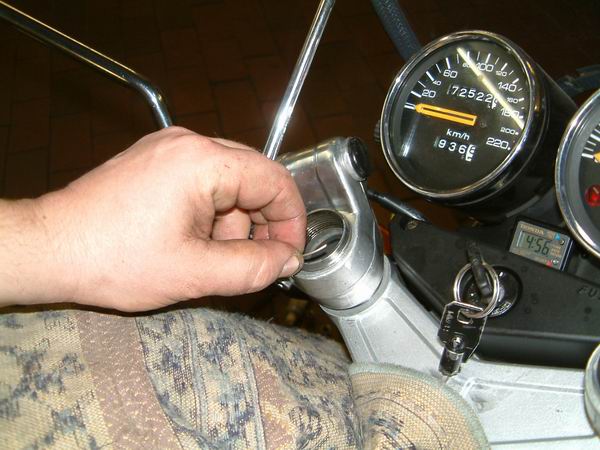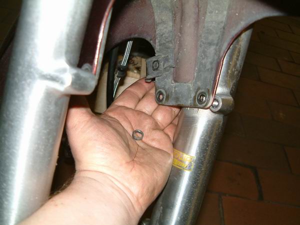 Als erstes Mopped aufbocken, dann die Gabelstopfen oben abschrauben, damit derTank keinen Schaden leidet, lege ich einen alten Teppich darüber. DieGabelstopfen stehen unter Umständen unter Spannung und können einementgegenschnalzen. Das kann man weitgehend verhindern, wenn durch das Aufbockendie Gabel wirklich ganz ausgefedert ist. Nach dem Abschrauben der Stopfen untendie 10er Gabelölablaßschrauben aufmachen (Wanne unterstellen nicht vergessen).Warten bis nichts mehr rauskommt, Gabelstopfen oben wieder draufschrauben. Einbekannter Gag ist, wenn jemand die Ablaßschrauben ohne vorheriges Öffnen derGabelstopfen aufmacht ;-)