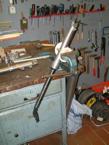 Jetzt wirds knifflig! Die Gabel am Tauchrohr vorsichtig (Bruchgefahr!) mitBierfilzl, Pappe, Kunststoff oder Weichholz am Schraubstock einspannen. Federund Stopfen müssen drin sein.
