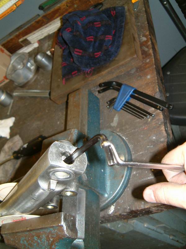 Die untere Schraube sauber machen, (WD 40) Den Inbus ganz einfügen mit Hammer,(wenn man Inbus Steckschlüssel für die Ratsche zur Hand hat mit dem Hammer dieSchraube prellen um das Aufschrauben zu erleichtern) Keinen verwanzten oderInbus mit Kugel verwenden! Verlängerung über den Inbus (ich verwende immereinen gekröpften Ringschlüssel) und mit Schmackes die Schraube öffnen. (EinDruckluftschrauber ist natürlich toll...)
