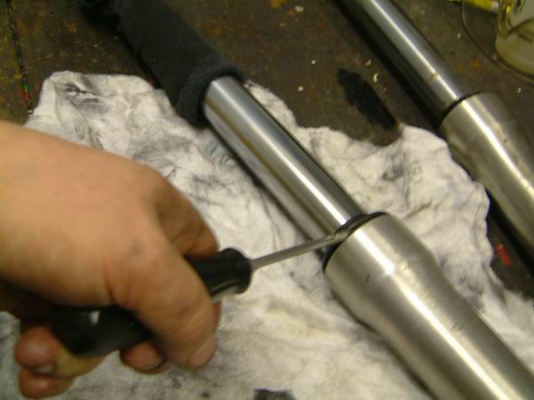 Den Dichtring bekommt man heraus, wenn man Tauch und Gabelrohr mit Schwungmehrmals auseinanderzieht...