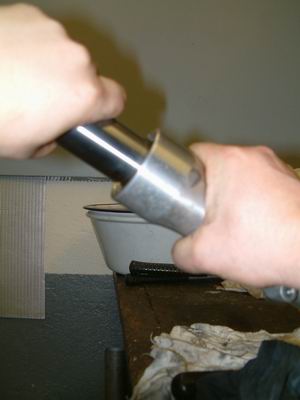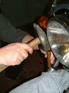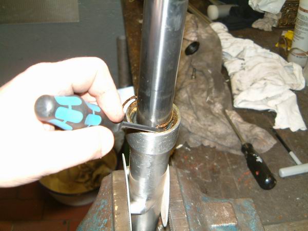 Dummerweise ist das eigentliche Foto vom Eintreiben des Simmerrings nixgeworden deshalb hier nachgestellt:Im Zubehör gibt es dafür auch extra Eintreibwerkzeug. Es geht aber auch so. Ambesten wenn einem jemand das Rohr dabei festhält oder man es im Schraubstockoder in der Gabelbrücke eingeklemmt...Den alten Simmerring über dem neuen, mit einem Kupfer oder Hartholz gleichmäßigringsrum den Simmerring und die Geleitbüchse mit festen Hammerschlägeneintreiben. Das Kupfer oder das Holz soll die Beschädigung des Tauchrohresverhindern. Keinesfalls mit dem Hammer gegen das Tauchrohr schlagen! Danachalten Gabelring (der ca halb drinsteckt) mit Schraubenzieher entfernen.