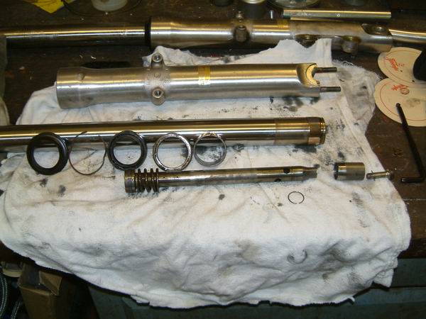 Hier die einzelnen Komponenten der Gabel, zu beachten die verschlissenen(deshalb kupfernen) Gleitbuchsen, die Sicherungsringe und die untereDämpfungshülse (mit dem geschliffenen Kegel ).