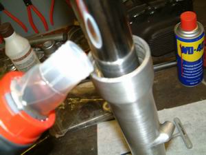 Die Gabel mit WD 40, fusselfreien Lappen (mit Schnur zum wiederausziehen) undStange reinigen. Flächen innen nicht beschädigen (teilweise gibt es ordentlicheLunker innen). Die Sitzfläche des Simmerrings evtl mit Messing Drahtbürstereinigen, Keine Bürstenhaare oder Brösel ins Innere des Gleitrohrs bringen,Lappen reinstopfen.