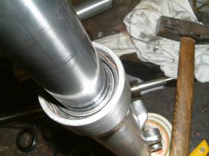 Ich bewahre immer alles in einem Tütchen auf, da kann nichts verschmutzen oderverlorengehen. Die Dämpfungshülse unten beim Zusammenbau mit der geschliffenenSeite nach oben einbauen. Die Schraube mit Dichtmasse einstreichen. Gabelfeder,Distanz, Ring, und Stopfen drauf, Schraube unten festziehen. Ablaßschraube mit(neuer?) Kupferdichtung wieder reinschrauben. Nicht zu fest anziehen! Danachist oben die Reihenfolge Gleitbüchse, Distanzscheibe, Simmerring. Simmerringund Gleitbuchsen ringsrum einölen. Die Gleitbuchsen mit dem Schlitz quer zurFahrtrichtung einsetzen. Distanzseibe darüber scharfe Seite nach unten. DenSimmerring mit der beschrifteten Seite nach oben bzw mit den Federn nach unten(Zubehörringe haben manchmal auf beiden Seiten Federn). Die Rillen oben an derGabel gegebenenfalls mit Tesaband überkleben um beim Aufschieben den Dichtringnicht zu beschädigen. Alten Simmerring darüberschieben...
