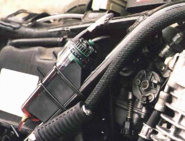 Im Prinzip wird die Unterdruckschwankung im Ansaugtrakt dazu genutzt um eine Kolbenpumpe zu betätigen, die tröpfchenweise Öl auf die Kette träufelt. Die Menge kann man einstellen, das Öl muß alle 500-1000 Km nachgefüllt werden. Vorteil ist die gleichmäßige Benetzung und die saubere, länger haltende Kette. Ich bin überzeugt, daß die Reibung spürbar reduziert wird. Die Kette muß fast nicht mehr nachgespannt werden. Nachteil ist die Verschmutzung der Felge durch Öltröpfchen. Das Öl geht aber im Vergleich zum Kettenfett leicht ab beim Reinigen.