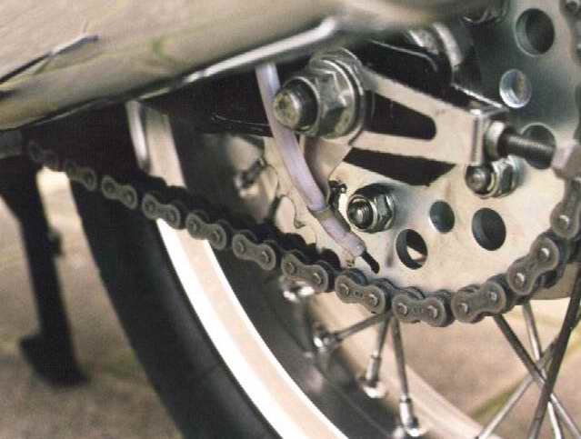 die Entlüftung oben am Rahmen Richtung Batterie verlegen. Den durchsichtigen Schlauch unten am Oiler zwischen Luftfilterkasten und Öltank auf die Kettenseite führen. Ich habe den Kettenschutz mit einigen Bohrungen versehen und den Schlauch daran entlang geführt. Die eigentliche Zuführspitze habe ich mit der mitgelieferten Öse an der Steckachse befestigt. Bei meiner MuZ habe ich alles an die Unterseite der Schwinge geklebt. Das hält auch... und bietet den Vorteil, daß man beim Radausbau nicht so fummeln muß.