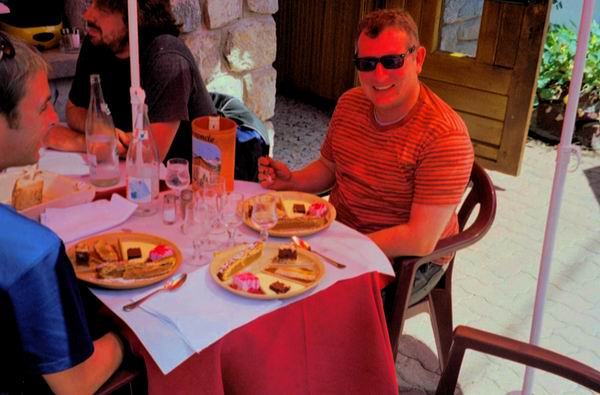 Die Weiterfahrt führte uns zum Kleinen St. Bernhard und weiter uns Tal nach Bourg-St. Maurice. Dort wurde es natürlich wieder knackig heiß. Im Tal entlang fuhren wir weiter bis Moutiers, wo wir uns um einen Platz zum Mittagessen umsahen. Am besten im Schatten, es wurde langsam schweinisch heiß. Am Marktplatz fanden wir dann das richtige Bistrot unter Sonnenschirmen zum Schlemmen.