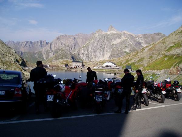 Am 6.Tag standen wir wie üblich früh auf und mussten feststellen, dass Mario schon angekommen war. Bald waren alle fertig versammelt und es konnte (bei bestem Wetter natürlich) losgehen. Die Gruppe A bestand diesmal aus Johannes, Mario, Matthias, Ralf und mir. In der Hektik der Abfahrt hatten wir leider vergessen, uns von Thomas zu verabschieden. Zur Einstimmung war erstmal der Große St. Bernhard angesagt. Munter ließ ich es laufen und bald war von den Mitfahrern nichts mehr im Rückspiegel zu sehen. Da tauchten plötzlich Peter und Mario auf undkamen schnell näher. Tja, die hatten Leistung satt. Da hilft nur noch eins: Gaaaas! Immer schön über 6000 Touren halten, dann geht schon was. Ich hielt tapfer dagegen, da tauchte auch schon die Passhöhe auf. Nach und nach trudelten alle ein und wir machten eine Rast.