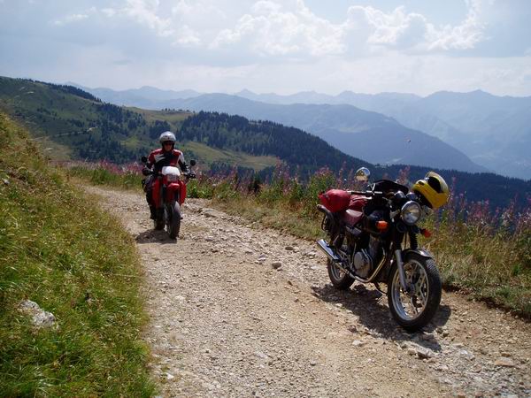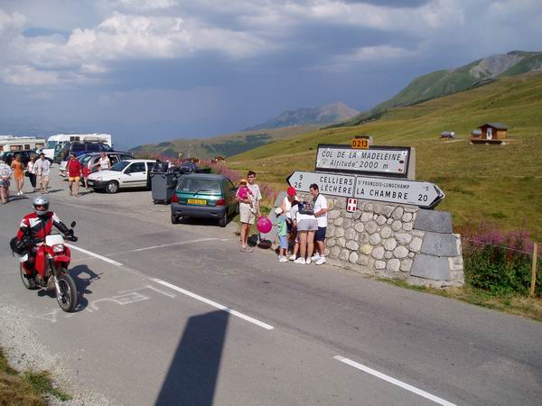 So langsam dämmerte uns, dass wir vielleicht doch die falsche Abzweigung genommen hatten. Als der Weg wieder nach unten führte, war die Sache klar. Na gut, wir hatten das letzte Stück zum Refuge verpasst, waren aber trotzdem auf unsere Kosten gekommen. Die Abfahrt ins Tal über Notre Dame de Pré entschädigte uns dafür. Die Kurven schienen kein Ende zu nehmen und die aufkommende Hitze nötigte uns eine Abkühlung in einem Brunnen zu nehmen. Endlich im Tal angelangt passierten wir wieder Moutiers und machten uns auf den Weg zum Col de la Madeleine. Die Strecke war eigentlich für die XBR sehr schön, kurvig, schmal, nette Straßenführung. Leider war fast die ganze Auffahrt mit dickem Rollsplitt gepflastert, es ging also im Zuckeltempo rauf. Auf der Passhöhe machten wir eine fällige Kaffeepause. Dabei bemerkten wie hinter uns eine riesige schwarze Wolkenfront näher kam, zum ersten Mal auf der ganzen Tour.