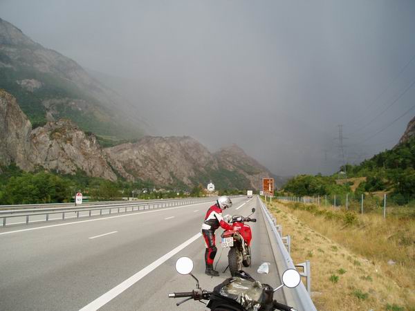 Wir machten uns also lieber auf die Socken. Der aufkommende Wind ließ nicht Gutes erahnen. An der Abzweigung zum Col de Chaussy, der uns zur Montvernier-Serpentinenstraße führen sollte fing es auf einmal zu tröpfeln an. Wir suchten schnell das Weite und fuhren weiter ins Tal nach la Chambre und dort gleich auf die Autobahn, um dem Gewitter zu entkommen. Als wir aber um eine Kurve bogen war ungefähr einen Kilometer vor uns eine Wand aus Regen. Das sah nicht gut aus!