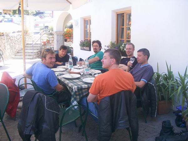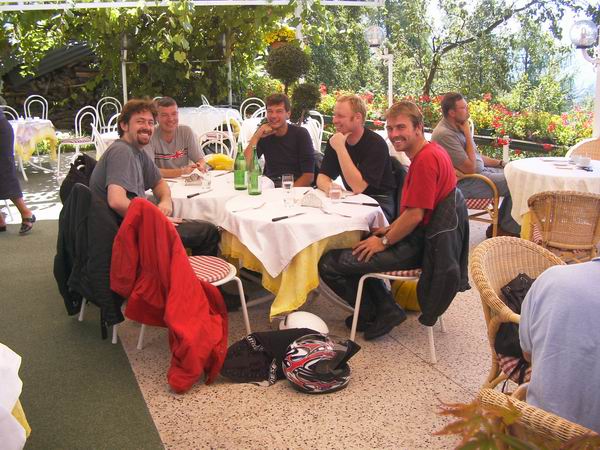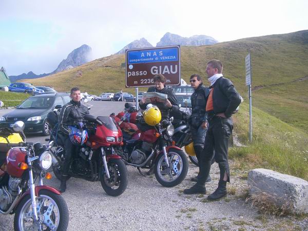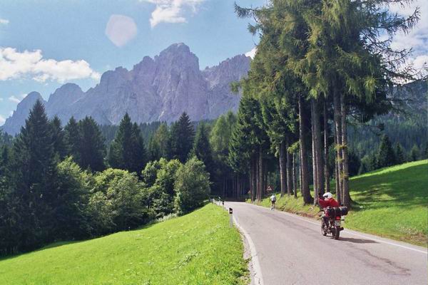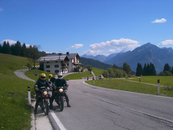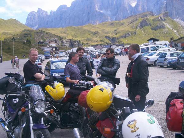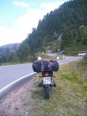 und runter ging es nach Predazzo. Vorm Ort wurde brav auf alle gewartet, im Ort haben wir uns dann eigenartigerweise aus den Augen verloren. Peter, der vorausfuhr, hielt nach weiteren zehn Kilometern an, da von den Nachfolgenden weit und breit nichts zu sehen war. In der weiteren Stunde, in denen wir in der brütenden Sonne auf Martin und Thomas warteten, entschied sich Ralf, nach Hause zurückzufahren, da seine Bremsscheibe (3 mm?) einem Harakiri-Schwert glich, mit vergleichbarer Gefährlichkeit. Schweren Herzens verabschiedete er sich von uns und wir drehten um, um die anderen systematisch zu suchen (eine ausgesandter Spähtrupp hatte sie nicht entdecken können).