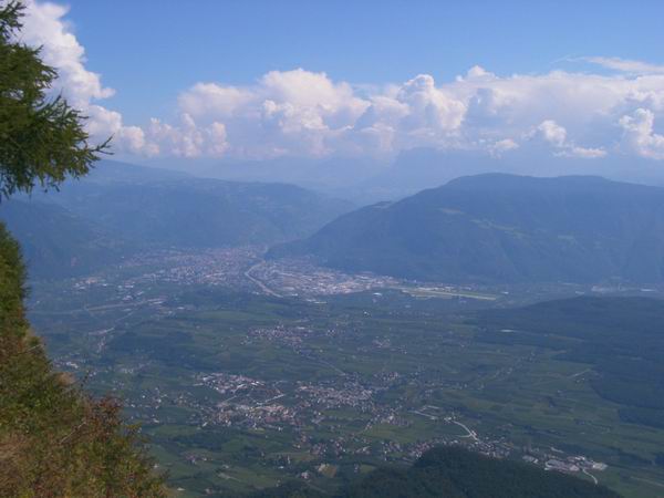 Bereits jetzt schon wurden Pläne für das nächste Jahr gemacht. Auch der anschliessende Zeltabbau zog sich in die Länge, da keiner so richtig nach Hause wollte. Irgentwann war auch das geschafft und wir begaben uns wieder mit Sack undPack auf die Piste. Erst mal zum Tanken. Es gestaltete sich danach schwierig, Thomas XBR wieder anzubekommen (jaja, wie gesagt, Anlasser ausbauen spart Gewicht). Runter ins Etschtal und in Richtung Kalterer See ging es weiter zum Mendelpass. In Vorjahr hatten wir dort ja noch mühsam ein Nachtquartier gesucht (=>Alpentour 2001). Es drängte uns aber ganz hoch hinauf auf den Aussichtspunkt. Von dort hat man einen fantastischen Ausblick über den Kalterer See, das Etschtal und auf die Dolomiten