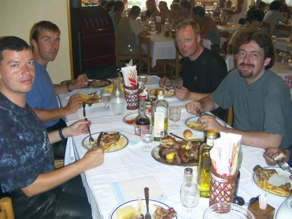Abends: Es treffen bei mir in Miesbach ein: Peter & Gernot, Matthias, Ralf (der sich von mir ein altes Anlassergetriebe minahm, aber nicht die alte Bremsscheibe). Bei Pimientos al Piquillo und viel rrrrrotem Wein wurde zünftig die Routenplanung und alles mögliche diskutiert (den Ralf hatte man ja seit Jahren nicht mehr zu Gesicht bekommen).