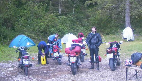 die Zeltnachbarn um Werkzeug gebeten. Dabei handelte es sich um zwei Familien, die mit Kind und Kegel und zwei alten R 80 Gespannen unterwegs waren. Aus den Tiefen des Seitenwagens, der zur Stabilisierung einen halben Zentner Werkzeug enthielt, tauchte dann tatsächlich ein 24er Schlüssel auf, der für das Aufschrauben der Ventildeckel benötigt wurde. Da ich aber nach meinem Unfall noch nicht so bei Kräften war, musste der BMW-Fahrer mir die Deckel aufmachen (waren die aber fest! Jaja, ich weiss, keinen Wassereimer heben können, aber mit der XBR durch die Alpen brausen…). Die Überprüfung brachte bestürzendes zu Tage: das Ventilspiel betrug im kalten Zustand 0.00 mm und beim Lösen der Kontermutter machte es "Zing", da die Ventilfeder wohl unter Spannung stand. (Anmerkung von Johannes: AHRG?!%§ Was erzähl ich eigentlich immer auf der Seite Wahnsinniger, keine Bremsen, keine Wartung, nix...change User..) Wir wurde ganz anders: plötzlich ergab sich ein klares Bild der Probleme der letzten zwei Jahre: unruhiger Leerlauf, Absterben, schlechte Kompression.Ich hatte ca. zehnmal drei Vergaser ein- und ausgebaut, zerlegt, beschallt und gereinigt und mir monatelang den Kopf zerbrochen. Dabei war nur das Ventilspiel zu knapp. Warum, war mir auch klar: ich hatte drei Jahre und 20000 km zuvor neue Ventile bekommen. Da ich es aber nicht mehr gewohnt war, bei der XBR Ventile einzustellen, tat ich es auch nicht. Ich hatte noch nie ein zu strenges Spiel gehabt und wartete immer auf das Klappern, wenn es mal zu viel war. In diesem Fall hätte aber das Spiel wegen der neuen Ventile geprüft werden müssen. Diese arbeiten sich langsam in den Kopf hinein, was das Spiel immer mehr verkleinert. Das gibt es auch nur mit der XBR. Jedes andere Moped hätte es schon längst zerfetzt. Ein weiterer Beweis für XBR unkaputtbar! Kurz darauf sollte ich allerdings eines besseren belehrt werden. Kurz nach der Ausfahrt zur anschliessenden Tagestour (es ging wieder die Aussichtsstrasse hoch) ruckelte es im zweiten Gang. Und zwar unter Last. Ich konnte es kaum glauben! 230.000 km und schon is der zweite Gang hin! Erschütternd. Aber wie so oft: es geht auch ohne. In den Bergen ist es halt ein wenig unangenehm, aber es geht, wenn man den ersten Gang ausdreht und dann in den dritten schaltet. In Richtung Lavarone ging es dann an der Matthias W. Gedächtniskurve vorbei (=>Alpentour 2000). Irgentwann mussten wir eine halbe Ewigkeit auf Martin warten